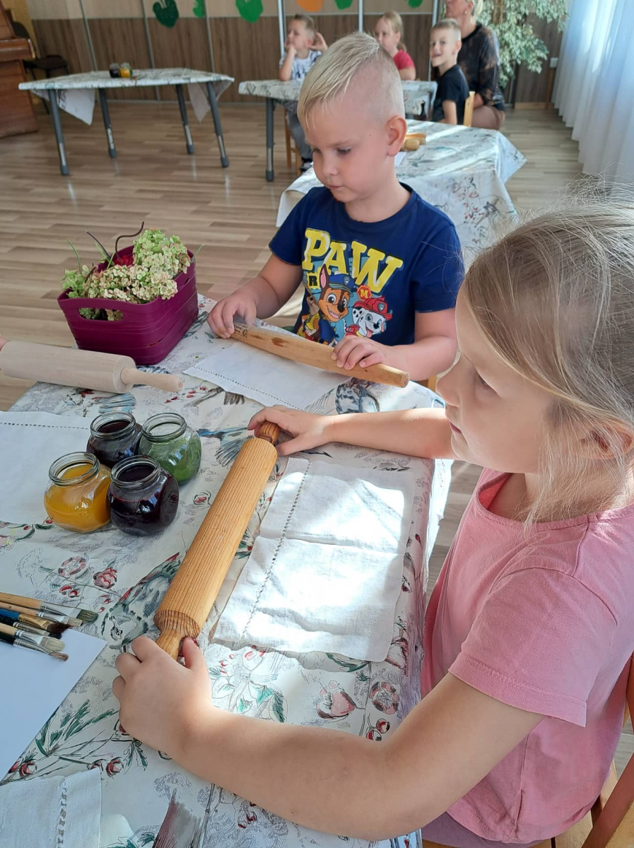 After the sports, project partners were invited to participate in the activity “Plant adorns us” organized by teacher A. Šarkauskienė with her student group. Natural dyes from vegetables and frui were created and used for painting linen fabric. Later bags for tea were made from it.